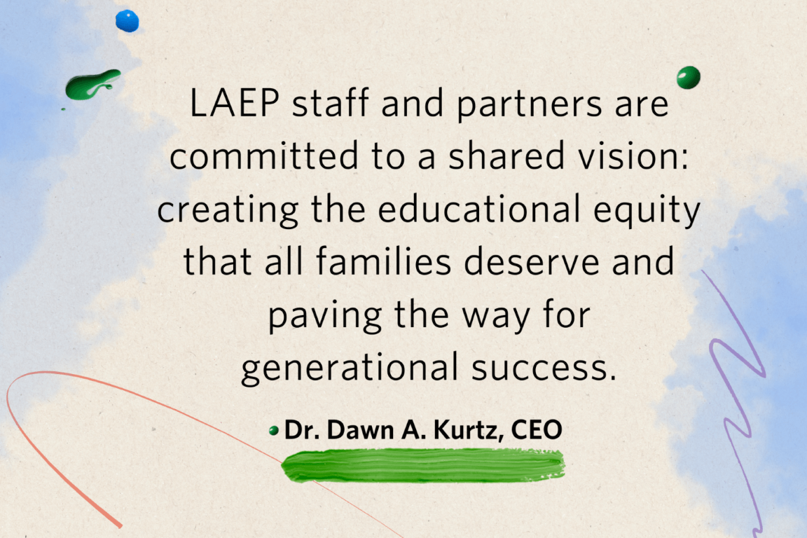 Los Angeles Education Partnership (LAEP) is a 501(c)(3) nonprofit that advances educational equity. Together with families, schools, and the community, LAEP facilitates access to and opportunities for quality educational and wellness practices so that children thrive from diapers to diplomas.