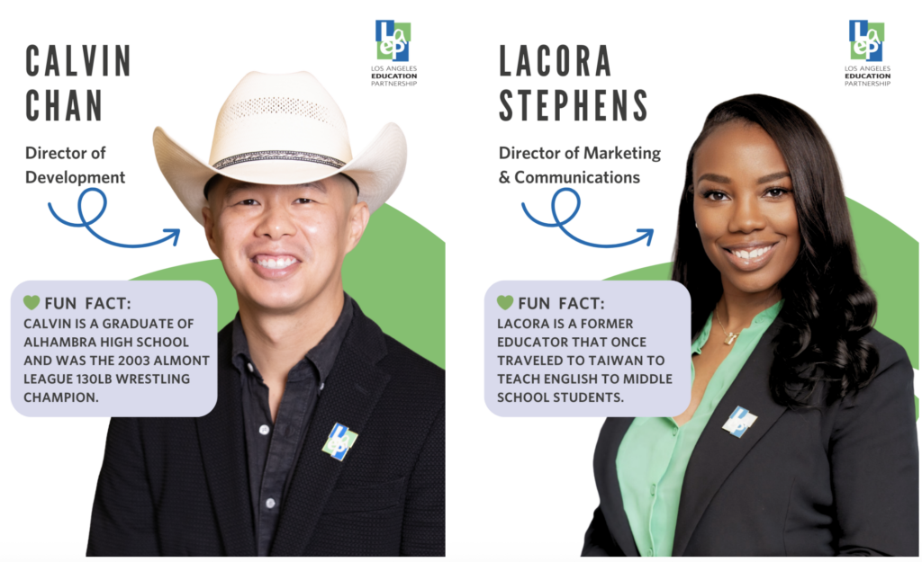 Before we look ahead, we want to celebrate two directors who just hit their one-year mark with LAEP. Over the last year, they’ve played a huge part in helping us share our story and grow our reach.